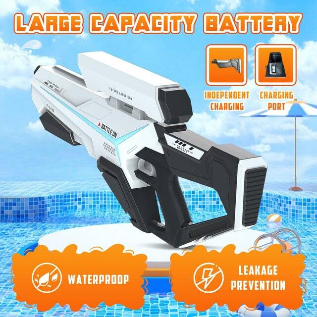 "description": "<ul>\n <li><strong>Large Water Tank:</strong> Equipped with a 750ml high-capacity tank for extended playtime without frequent refills</li>\n <li><strong>Smart Design:</strong> Automatic water absorption with one-button activation—no manual refilling needed</li>\n <li><strong>High Performance:</strong> Powerful and stable water output with long-range accuracy for outdoor battles</li>\n <li><strong>Summer Fun:</strong> Ideal for pool parties, water parks, and backyard play; perfect for parent-child interaction</li>\n <li><strong>Minimalist Appearance:</strong> Sleek white design with ergonomic, non-slip grip for comfortable handling</li>\n</ul>",