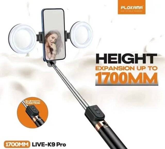 "description_ar": "<div dir=\"ltr\"><h3>Key Attributes</h3>\n<ul>\n <li><strong>Brand / Model:</strong> K9 Pro 4‑in‑1 Tripod LED Remote Control</li>\n <li><strong>Product Type:</strong> 1.7 m selfie stick tripod with LED and Bluetooth remote</li>\n\n <li><strong>Maximum Length:</strong> 170 cm (1.7 m)</li>\n <li><strong>Folded Length:</strong> 30 cm</li>\n <li><strong>Remote Distance:</strong> Up to 10 m</li>\n\n <li><strong>Material:</strong> Iron & plastic</li>\n <li><strong>Orientation:</strong> Supports portrait and landscape</li>\n\n <li><strong>Lighting:</strong> LED light</li>\n\n <li><strong>Bluetooth Remote Use:</strong> \n Press and hold the button for 3 seconds until the indicator light appears → \n search for <strong>Live‑K9 Pro</strong> → connect and ready to use\n </li>\n\n <li><strong>How to Disable:</strong> Turn off Bluetooth on the remote or disconnect from the device</li>\n</ul>\n</div>",