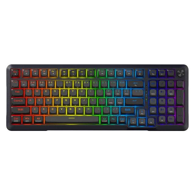 "description_ar": "<div dir=\"ltr\"><h3>Key Features</h3>\n<ul>\n <li><strong>Layout:</strong> 75% TKL layout</li>\n <li><strong>Connectivity Modes:</strong> 3‑mode (Wireless / Bluetooth / Wired)</li>\n <li><strong>Structure:</strong> Gasket‑mounted design for softer keystrokes and reduced vibration</li>\n <li><strong>Lighting:</strong> Full RGB with multiple effects</li>\n <li><strong>Battery Capacity:</strong> 4000 mAh</li>\n <li><strong>Hot‑Swappable:</strong> Yes, supports switch replacement without soldering</li>\n <li><strong>Keycaps:</strong> Side‑engraved PBT keycaps</li>\n <li><strong>Switches:</strong> Pre‑lubed linear switches</li>\n</ul>\n</div>",