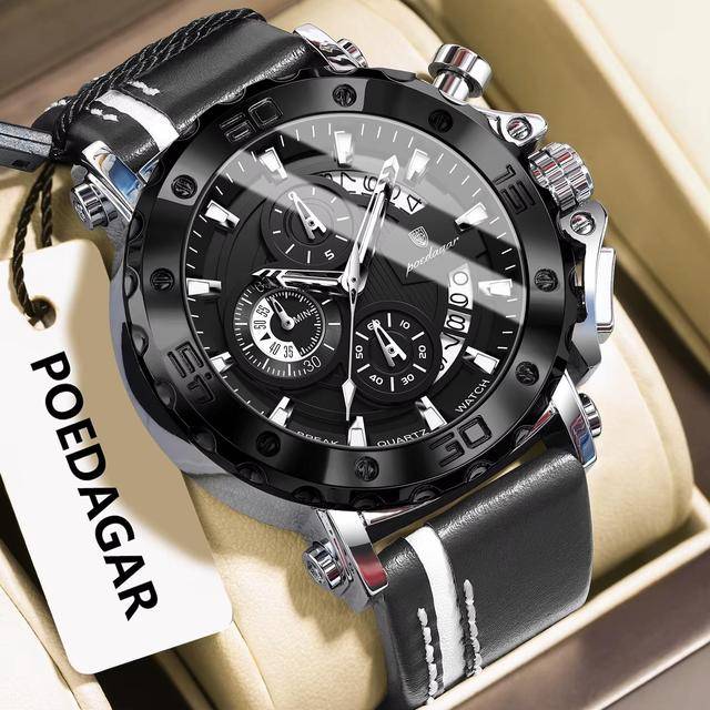 "description": "<ul>\n <li>Brand Name: Poedagar</li>\n <li>Model Number: 873L</li>\n <li>Year of Production: 2025</li>\n <li>Gender: Men</li>\n <li>Case Shape: Round</li>\n <li>Material: Alloy</li>\n <li>Band Material Type: Leather</li>\n <li>Case Material: Alloy</li>\n <li>Dial Window Material Type: Hardlex</li>\n <li>Dial Display: Pointer</li>\n <li>Clasp Type: Buckle</li>\n <li>Movement: Quartz</li>\n <li>Movement Brand: Chenlong</li>\n <li>Feature: Day/Date, Luminous, Water Resistant, Waterproof</li>\n <li>Style: Luxury, Sport</li>\n <li>Type: Charm, Fashion, Luxury, Sport</li>\n <li>Band Length: 24 cm</li>\n <li>Band Width: 23 mm</li>\n <li>Case Thickness: 13 mm</li>\n <li>Dial Diameter: 44 mm</li>\n <li>Water Resistance Depth: 3 bar</li>\n <li>Weight: 76 g</li>\n <li>Warranty: 1 Year</li>\n <li>Boxes Included: Yes</li>\n <li>Place of Origin: China</li>\n</ul>",