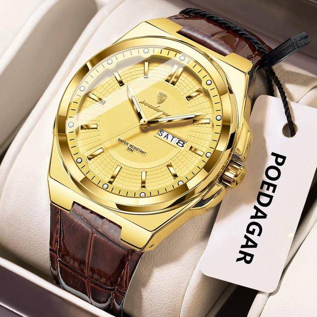 "description": "<ul>\n <li>Brand Name: Poedagar</li>\n <li>Model Number: 896L</li>\n <li>Year of Production: 2025</li>\n <li>Gender: Men</li>\n <li>Case Shape: Round</li>\n <li>Material: Leather</li>\n <li>Band Material Type: Leather</li>\n <li>Case Material: Alloy</li>\n <li>Dial Window Material Type: Hardlex</li>\n <li>Dial Display: Pointer</li>\n <li>Clasp Type: Buckle</li>\n <li>Movement: Quartz</li>\n <li>Movement Brand: Chenlong</li>\n <li>Feature: Day/Date, Luminous, Waterproof</li>\n <li>Style: Luxury, Simple, Sport</li>\n <li>Type: Charm, Fashion, Luxury, Sport</li>\n <li>Band Length: 25 cm</li>\n <li>Band Width: 24 mm</li>\n <li>Case Thickness: 12 mm</li>\n <li>Dial Diameter: 43 mm</li>\n <li>Water Resistance Depth: 3 bar</li>\n <li>Weight: 65 g</li>\n <li>Warranty: 1 Year</li>\n <li>Boxes Included: Yes</li>\n <li>Place of Origin: China</li>\n</ul>",