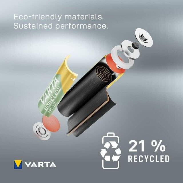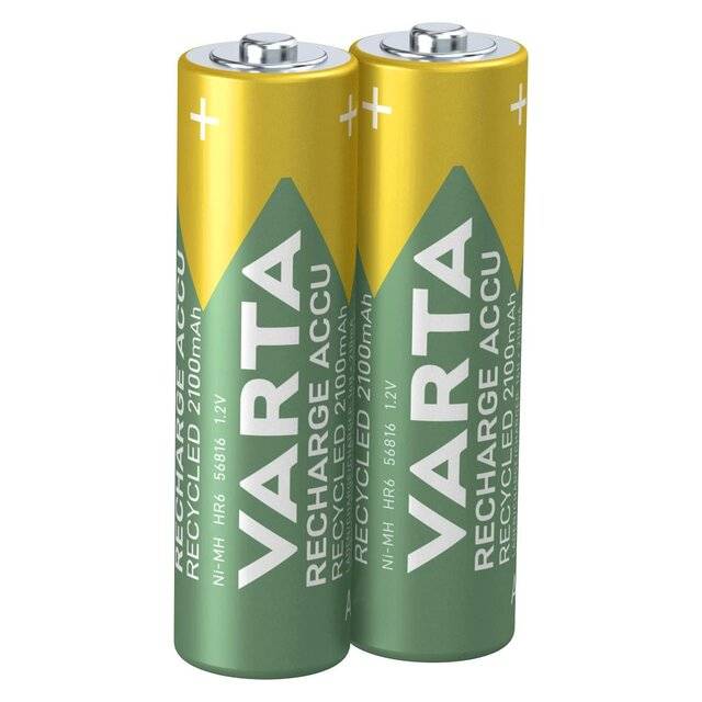"description": "<ul>\n <li><strong>Product Name:</strong> VARTA Recharge Accu Recycled AA Batteries</li>\n <li><strong>Capacity:</strong> 2100 mAh</li>\n <li><strong>Battery Type:</strong> Rechargeable NiMH AA (Mignon)</li>\n <li><strong>Recycled Content:</strong> 11% recycled material</li>\n <li><strong>Ready to Use:</strong> Pre-charged, no memory effect</li>\n <li><strong>Compatibility:</strong> Works with all common Ni-MH chargers</li>\n <li><strong>Performance:</strong> Up to 500 recharge cycles</li>\n <li><strong>Environmental Benefit:</strong> Low self-discharge – up to 70% residual capacity after 12 months storage</li>\n <li><strong>Recommended Applications:</strong> Photo flashes, digital cameras, torches, toys, and other everyday devices</li>\n <li><strong>Box Contents:</strong> 2 × AA 2100 mAh Rechargeable Batteries</li>\n</ul>",