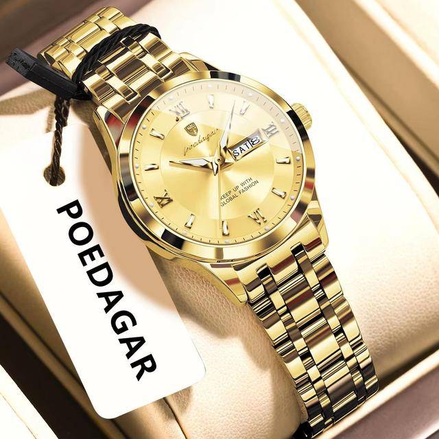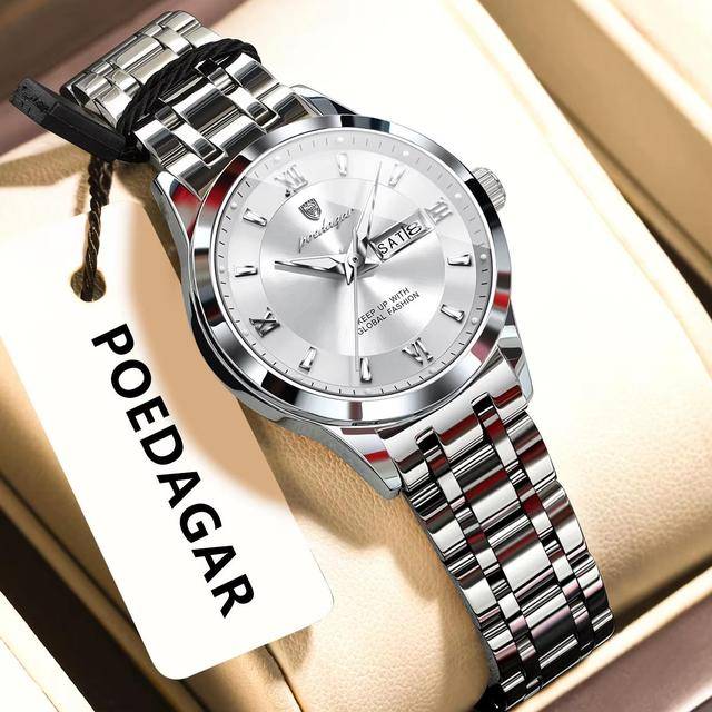 "description_ar": "<div dir=\"ltr\"><ul>\n <li>Brand Name: Poedagar</li>\n <li>Model Number: 503</li>\n <li>Year of Production: 2025</li>\n <li>Gender: Women</li>\n <li>Case Shape: Round</li>\n <li>Material: Stainless Steel</li>\n <li>Band Material Type: Stainless Steel</li>\n <li>Case Material: Alloy</li>\n <li>Dial Window Material Type: Hardlex</li>\n <li>Dial Display: Pointer</li>\n <li>Clasp Type: Push Button Hidden Clasp</li>\n <li>Movement: Quartz</li>\n <li>Movement Brand: Chenlong</li>\n <li>Feature: Day/Date, Luminous, Water Resistant, Waterproof</li>\n <li>Style: Casual, Business, Luxury</li>\n <li>Type: Antique, Charm, Fashion, Luxury</li>\n <li>Band Length: 20 cm</li>\n <li>Band Width: 20 mm</li>\n <li>Case Thickness: 11 mm</li>\n <li>Dial Diameter: 32 mm</li>\n <li>Water Resistance Depth: 3 bar</li>\n <li>Weight: 78 g</li>\n <li>Warranty: 1 Year</li>\n <li>Boxes Included: Yes</li>\n <li>Place of Origin: China</li>\n</ul></div>",