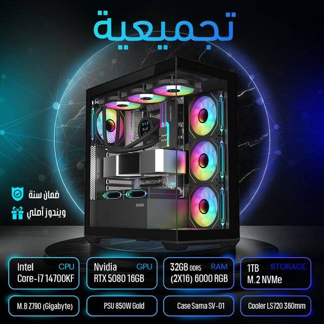 "description_ar": "<div dir=\"ltr\"><ul>\n <li>Intel Core-i7 14700KF</li>\n <li>Nvidia RTX 5070Ti 16GB</li>\n <li>RAM 32GB (2X16) DDR5 6000 RGB</li>\n <li>M.B Z790</li>\n <li>1TB M.2 NVMe</li>\n <li>PSU 850 Gold</li>\n <li>Case Sama SV-01</li>\n <li>Cooler LS720 360mm RGB</li>\n</ul>\n</div>",
