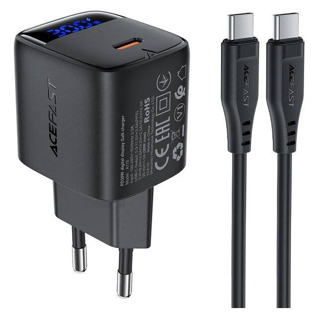 "description": "<ul>\n <li>Product Name: ACEFAST A115 PD30W GaN Wall Charger</li>\n <li>Input: AC 110–240V, 0.9A, 50Hz/60Hz (EU plug)</li>\n <li>Output (USB-C): 5V–11V⎓3A (PPS), 5V⎓3A, 9V⎓3A, 12V⎓2.5A, 15V⎓2A, 20V⎓1.5A — up to 30W</li>\n <li>Supported Protocols: PPS, PD3.0, PD2.0, QC4+, QC3.0, QC2.0, AFC, FCP, SCP</li>\n <li>Material: Flame-retardant PC</li>\n <li>Size: 72 × 38.2 × 32.6 mm</li>\n <li>Weight: Charger – 65g, Cable – 30g</li>\n <li>Certification: CE, RoHS, EAC, ERP6</li>\n <li>Display: LED digital display with fast charging indicator</li>\n <li>Technology: GaN for stable charging, efficient cooling, and compact size</li>\n <li>Cable Included: 1.2m USB-C to USB-C charging data cable</li>\n <li>Device Compatibility: Phones, tablets, game consoles, and more</li>\n <li>Safety: Multiple protection features for safe charging</li>\n</ul>",