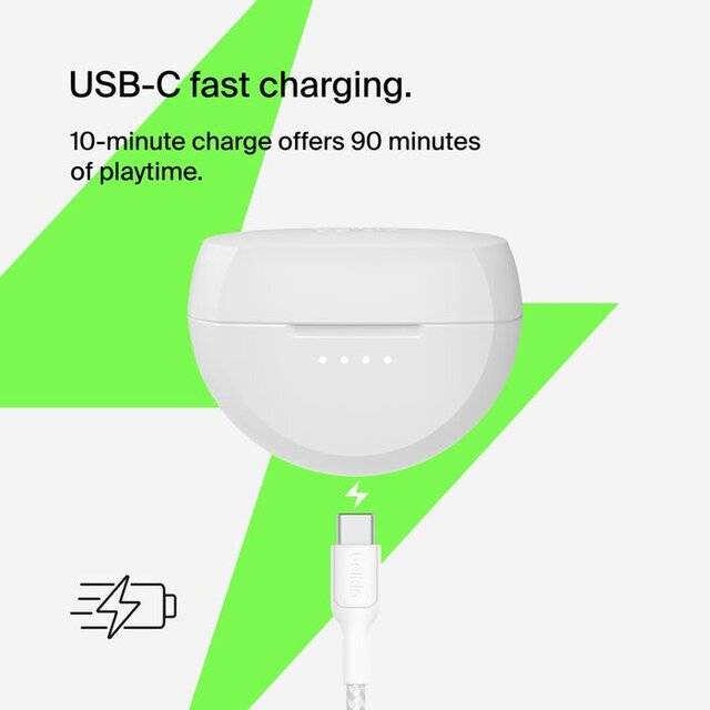 "description": "<ul>\n<li>Extended battery life gets at least 8 hours of non-stop playtime, with an additional 20 hours of battery life in the charging case </li>\n<li>Clear Call Quality technology reduces background noise so your voice is heard during calls </li>\n<li>Bluetooth multipoint technology for simultaneous two-device connection </li>\n<li>Belkin Signature Sound delivers full, balanced high-fidelity audio </li>\n<li>IPX5-rated sweat and splash resistance </li>\n<li>USB-C fast charging compatible </li>\n<li>Small, compact design with slim charging case easily fits in pockets and bags </li>\n<li>Charge fast: 10 min. of charging gets 90 minutes of playtime </li>\n<li>Seamless Bluetooth 5.3 pairing with 30 ft./10m range </li>\n<li>Product made with recycled plastic** </li>\n<li>100% plastic-free packaging </li>\n</ul>",