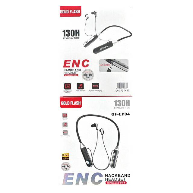 "description_ar": "<div dir=\"ltr\"><h3>Key Features</h3>\n<ul>\n <li><strong>Brand:</strong> Gold Flash</li>\n <li><strong>Product Type:</strong> ENC Neckband Headset</li>\n <li><strong>Wireless Version:</strong> V5.4</li>\n <li><strong>Standby Time:</strong> 130 hours</li>\n <li><strong>Charging Port:</strong> Type‑C</li>\n <li><strong>Features:</strong>\n <ul>\n <li>Fast charging</li>\n <li>LED power display</li>\n <li>Real stereo</li>\n <li>Magnetic earbuds</li>\n <li>Hi‑Res Audio (GF‑EP04 model)</li>\n </ul>\n </li>\n <li><strong>Model Variants:</strong>\n <ul>\n <li>Standard ENC Neckband Headset</li>\n <li>GF‑EP04 ENC Neckband Headset</li>\n </ul>\n </li>\n</ul>\n</div>",