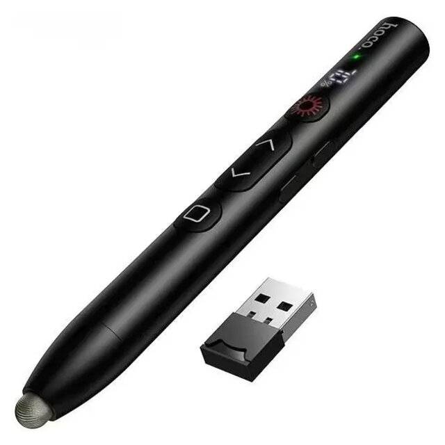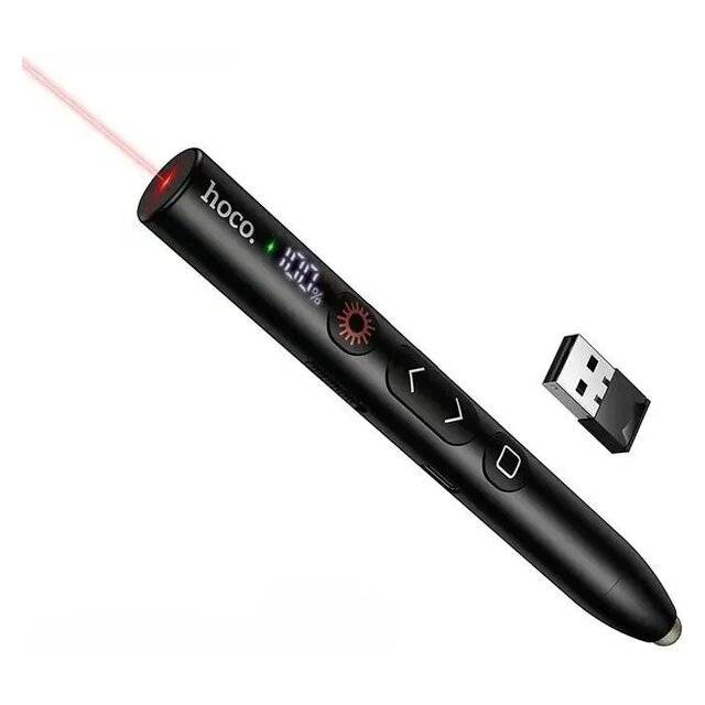 "description": "<ul>\n <li><strong>Product Name:</strong> HOCO GM203 2-in-1 Laser Pointer</li>\n <li><strong>Functionality:</strong> Combines laser pointer and touch screen pen for presentations and general use</li>\n <li><strong>Connection:</strong> Wireless via USB 2.4 GHz for stable transmission</li>\n <li><strong>Control Features:</strong> \n <ul>\n <li>Slide Change Button</li>\n <li>Black Screen Button (screen off)</li>\n <li>Hyperlink Button (open links)</li>\n <li>Volume Control Button</li>\n </ul>\n </li>\n <li><strong>Usage:</strong> Plug and Play — no software installation required</li>\n <li><strong>Material:</strong> High-quality ABS for durability and lightweight handling</li>",