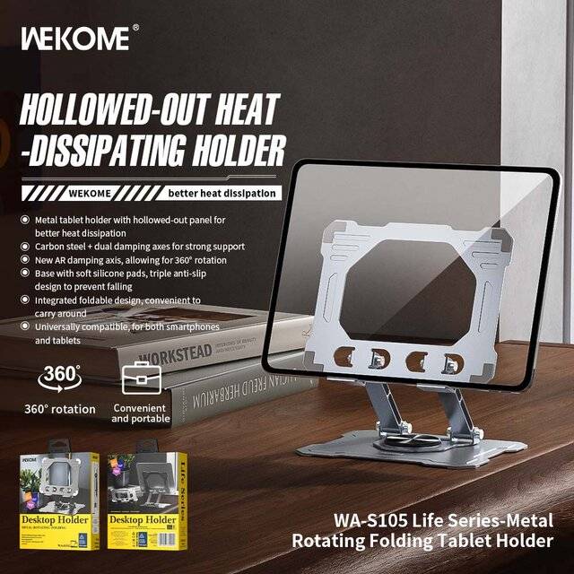 "description_ar": "<div dir=\"ltr\"><ul>\n <li><strong>Model Number:</strong> WA-S105</li>\n <li><strong>Material:</strong> Anti-slip silicone pad + carbon steel</li>\n <li><strong>Function:</strong> Tablet holder</li>\n <li><strong>Product Weight:</strong> 364g</li>\n <li><strong>Packed Weight:</strong> 449g</li>\n <li><strong>Packed Dimensions:</strong> 169 × 140 × 39 mm</li>\n <li><strong>Units per Carton:</strong> 42 PCS</li>\n <li><strong>Carton Size:</strong> 60 × 33.5 × 25 cm</li>\n <li><strong>Gross Weight:</strong> 19.50 kg</li>\n</ul>\n</div>",