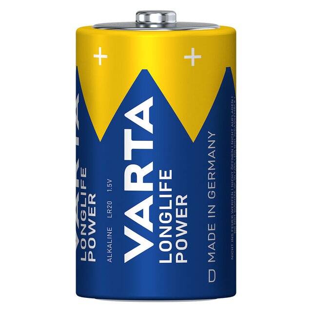 "description": "<ul>\n <li><strong>Product Name:</strong> VARTA Longlife Power D (Mono) Batteries</li>\n <li><strong>Electrochemical System:</strong> Alkaline</li>\n <li><strong>Voltage:</strong> 1.5 V</li>\n <li><strong>Size:</strong> D (Mono)</li>\n <li><strong>Diameter:</strong> 34.2 mm</li>\n <li><strong>Height:</strong> 61.5 mm</li>\n <li><strong>Weight:</strong> 136.9 g</li>\n <li><strong>Pack Size:</strong> 2 pcs</li>\n <li><strong>Performance:</strong> Precise energy delivery for high-energy-consuming devices</li>\n <li><strong>Recommended Applications:</strong> Remote-controlled toys, wireless mice, flashlights, electric toothbrushes, and other high-performance equipment</li>\n <li><strong>Packaging:</strong> Practical open-close design for easy opening and safe storage</li>\n <li><strong>Shelf Life:</strong> Guaranteed 10 years</li>\n</ul>",