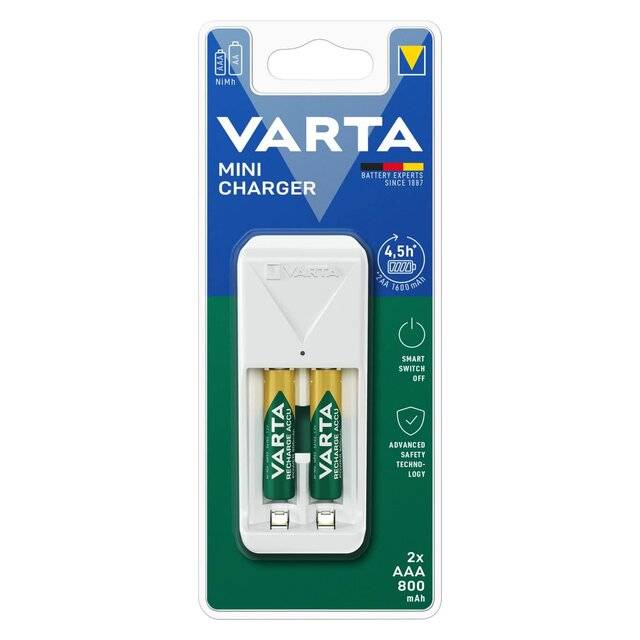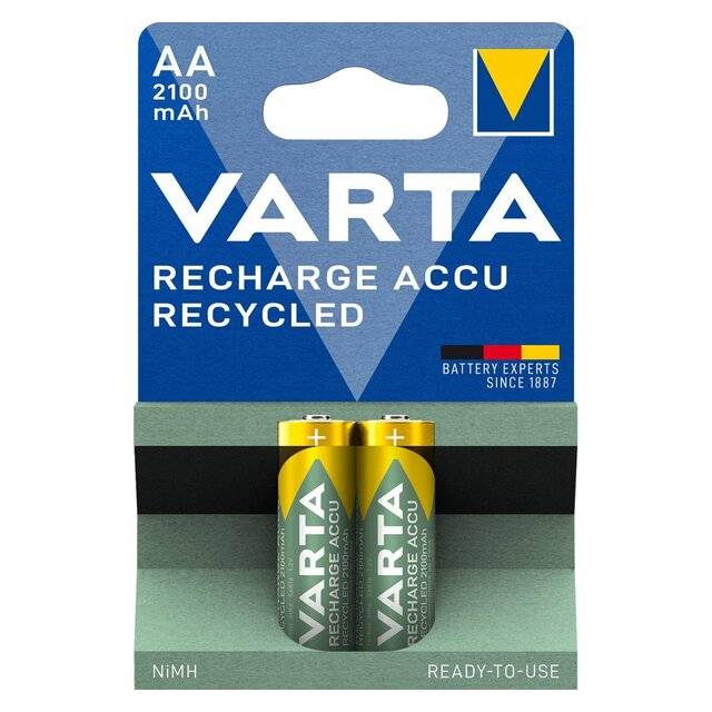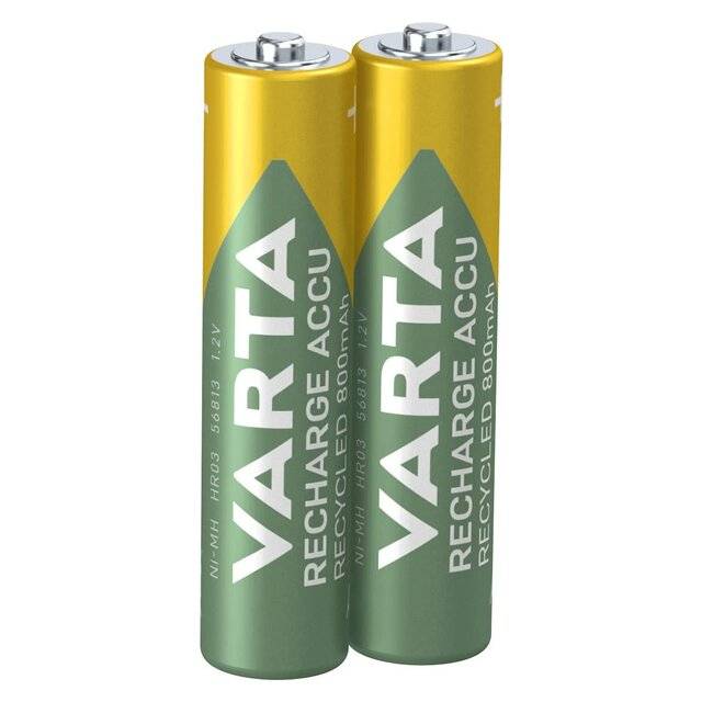 "description": "<ul>\n <li><strong>Product Name:</strong> VARTA Recharge Accu Recycled AAA Batteries</li>\n <li><strong>Capacity:</strong> 800 mAh</li>\n <li><strong>Battery Type:</strong> Rechargeable NiMH Micro (AAA)</li>\n <li><strong>Recycled Content:</strong> 21% recycled material</li>\n <li><strong>Ready to Use:</strong> Pre-charged, no memory effect</li>\n <li><strong>Compatibility:</strong> Works with all standard Ni-MH chargers</li>\n <li><strong>Performance:</strong> Suitable for high-drain applications</li>\n <li><strong>Environmental Benefit:</strong> Low self-discharge – up to 70% residual capacity after 12 months storage</li>\n <li><strong>Recommended Applications:</strong> Photo flashes, digital cameras, toys, flashlights, GPS devices, and more</li>\n <li><strong>Box Contents:</strong> 2 × AAA 800 mAh Rechargeable Batteries</li>\n</ul>",