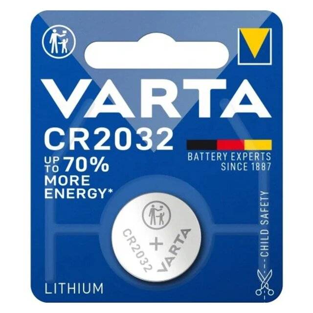 "description": "<ul>\n <li><strong>Model / Manufacturer Code:</strong> VARTA CR2032 (Type 6032)</li>\n <li><strong>Battery Type:</strong> Lithium Coin Cell</li>\n <li><strong>General Range / Equivalents:</strong> CR2032, DL2032, E-CR2032, ECR2032, BR2032, KCE2032, LM2032, SB-T51, H2327376, E2358808</li>\n <li><strong>Voltage:</strong> 3.0 V</li>\n <li><strong>Capacity:</strong> 230 mAh</li>\n <li><strong>Diameter:</strong> 20 mm</li>\n <li><strong>Height:</strong> 3.2 mm</li>\n <li><strong>Mass:</strong> 3.0 g per piece</li>\n <li><strong>Contents:</strong> Blister pack – 1 piece</li>\n</ul>",