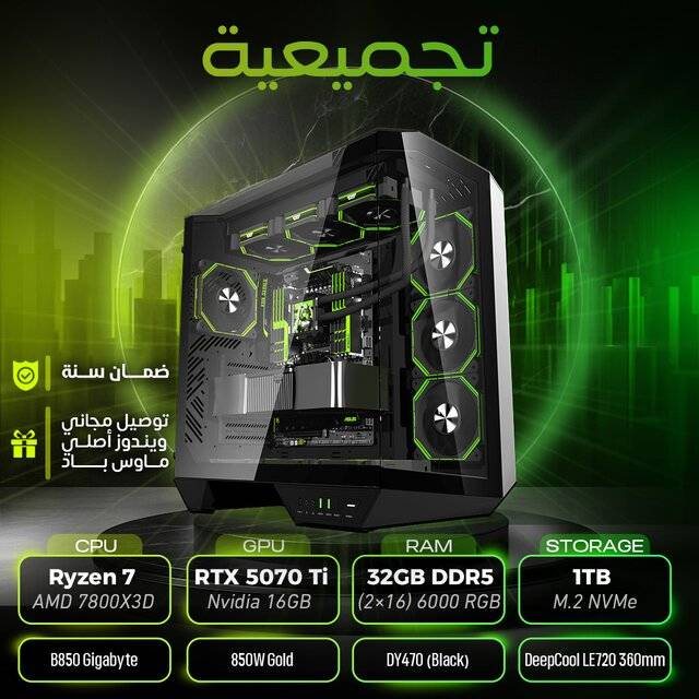 "description_ar": "<div dir=\"ltr\"><ul>\n <li>CPU: AMD Ryzen 7 7800X3D</li>\n <li>GPU: Nvidia RTX 5070 Ti 16GB</li>\n <li>RAM: 32GB DDR5 (2×16) 6000 RGB</li>\n <li>Motherboard: B850 Gigabyte</li>\n <li>Storage: 1TB M.2 NVMe</li>\n <li>PSU: 850W Gold</li>\n <li>Case: DY470 (Black)</li>\n <li>Cooler: DeepCool LE720 360mm RGB</li>\n</ul></div>",