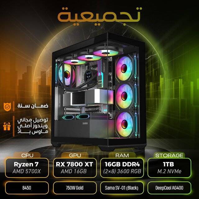"description_ar": "<div dir=\"ltr\"><ul>\n <li>CPU: AMD Ryzen 7 5700X</li>\n <li>GPU: AMD RX 7800 XT 16GB</li>\n <li>RAM: 16GB DDR4 (2×8) 3600 RGB</li>\n <li>Motherboard: B450</li>\n <li>Storage: 1TB M.2 NVMe</li>\n <li>PSU: 750W Gold</li>\n <li>Case: Sama SV-01 (Black)</li>\n <li>Cooler: DeepCool AG400</li>\n</ul></div>",