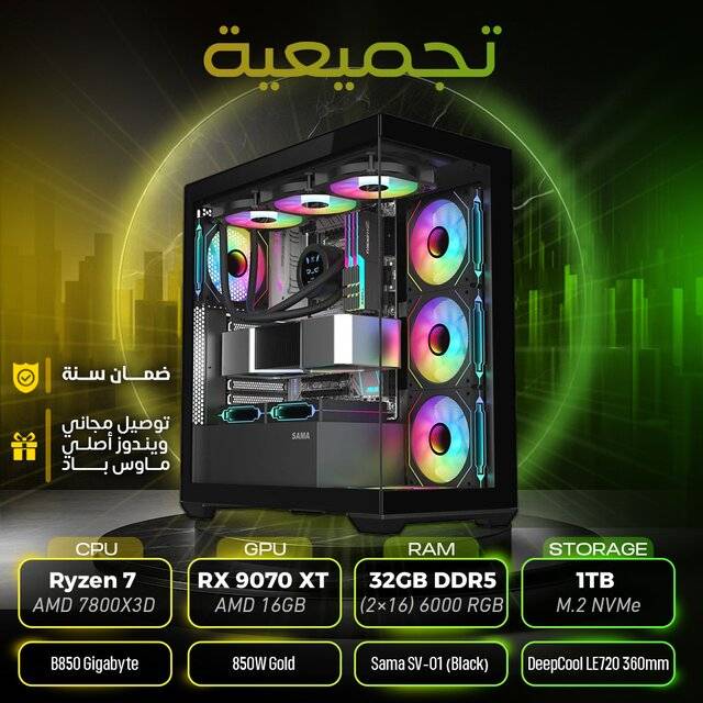 "description_ar": "<div dir=\"ltr\"><ul>\n <li>CPU: AMD Ryzen 7 7800X3D</li>\n <li>GPU: AMD RX 9070 XT 16GB</li>\n <li>RAM: 32GB DDR5 (2×16) 6000 RGB</li>\n <li>Motherboard: B850 Gigabyte</li>\n <li>Storage: 1TB M.2 NVMe</li>\n <li>PSU: 850W Gold</li>\n <li>Case: Sama SV-01 (Black)</li>\n <li>Cooler: DeepCool LE720 360mm RGB</li>\n</ul></div>",