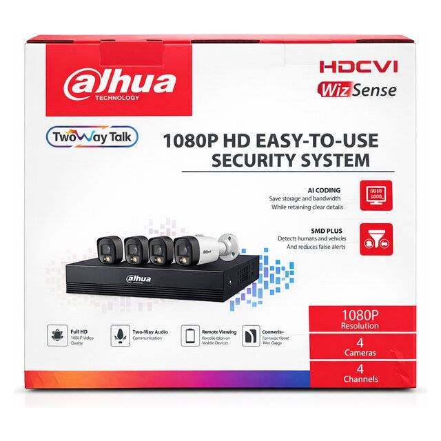 "description_ar": "<div dir=\"ltr\"><h3>Dahua HDCVI WizSense 1080P Security System</h3>\n<ul>\n <li><strong>Resolution:</strong> 1080P Full HD high-definition recording for crystal-clear security footage.</li>\n <li><strong>Camera Configuration:</strong> Includes a total of 4 cameras: two 2.8mm wide-angle cameras and two 3.6mm standard-view cameras.</li>\n <li><strong>Smart Detection (SMD Plus):</strong> Advanced AI technology designed to detect humans and vehicles while reducing false alarms.</li>\n <li><strong>Enhanced Compression:</strong> Utilizes AI Coding and Smart H.265+ to drastically reduce storage and bandwidth requirements without losing detail.</li>\n <li><strong>Audio:</strong> Supports Two-Way Talk for real-time communication through the system.</li>\n <li><strong>Weatherproofing:</strong> IP67-rated cameras designed for high reliability in outdoor and harsh weather conditions.</li>\n <li><strong>Remote Monitoring:</strong> Mobile App support for viewing video anytime/anywhere and Cloud Management via DoLynk Cloud.</li>\n <li><strong>Real-Time Performance:</strong> Features zero-latency transmission technology for immediate video feedback.</li>\n</ul>\n</div>",