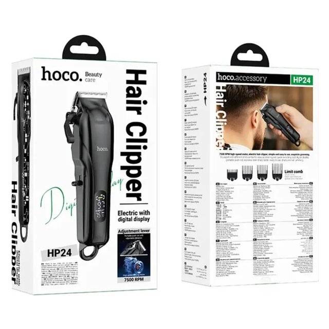 "description": "<ul>\n <li>Product Name: Hoco HP24 Hair Trimmer</li>\n <li>Motor: High-Speed 7500 RPM for powerful and efficient cutting</li>\n <li>Blade System: Durable 5CR15 stainless steel fixed and moving blades</li>\n <li>Cutting Lengths: Adjustable from 0.5mm to 2.5mm via built-in precision dial</li>\n <li>Battery Capacity: 2000mAh Lithium</li>\n <li>Run Time: Up to 180 minutes</li>\n <li>Display: LED battery percentage indicator</li>\n <li>Charging: USB Type-C for convenient recharging at home or while traveling</li>\n <li>Accessories: Includes 8 limit combs (1.5mm to 19mm), USB cable, charging base, and cleaning brush</li>\n</ul>",