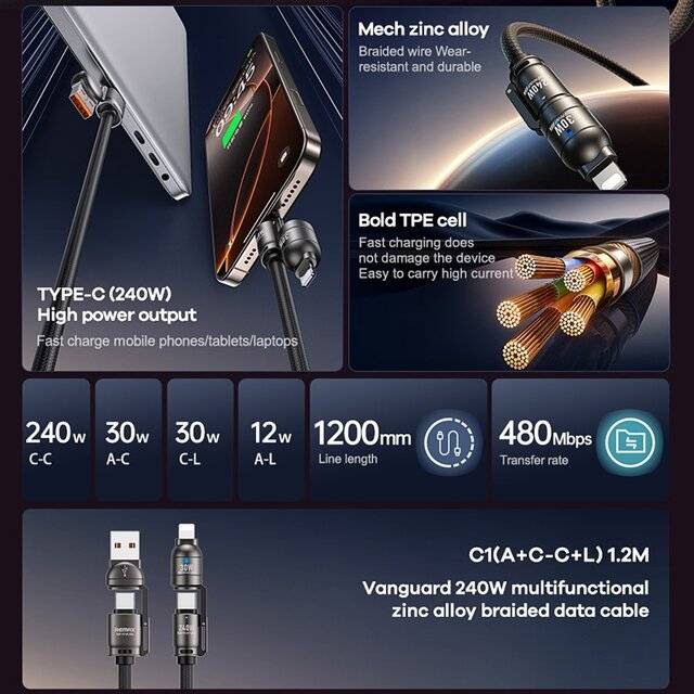 "description": "<h3>Specifications</h3>\n<ul>\n <li><strong>Model:</strong> REMAX C1</li>\n <li><strong>Cable Length:</strong> 1.2 m / 3.9 ft</li>\n <li><strong>Materials:</strong> Braided cable, TPE plug material, zinc alloy shell, adapter terminals</li>\n <li><strong>Connector Types:</strong> USB-A, USB-C, L Port</li>\n <li><strong>Output Current:</strong>\n <ul>\n <li>A to Lightning: 5V ⎓ 2.4A (12W)</li>\n <li>A to C: 15V ⎓ 2A (30W)</li>\n <li>C to C: 48V ⎓ 5A (240W)</li>\n <li>C to Lightning: 15V ⎓ 2A (30W)</li>\n </ul>\n </li>\n <li><strong>Cable Core Specifications:</strong>\n <ul>\n <li>Charging cable: 2 cores, Φ0.1 mm × 65 cores × 2C</li>\n <li>Data cable: 3 cores, Φ0.07 mm × 15 cores × 4C</li>\n </ul>\n </li>\n</ul>\n\n<h3>Features</h3>\n<ul>\n <li><strong>Versatile Multi-Function Cable:</strong> Supports laptops, tablets, and smartphones with USB-A + Type-C + L Port configuration</li>\n <li><strong>High-Power Charging:</strong> Delivers up to 240W for fast charging across multiple devices</li>\n <li><strong>Premium Build:</strong> Zinc alloy shell and braided cable for durability, anti-tangle use, and stylish mechanical design</li>\n <li><strong>Reliable Performance:</strong> Advanced core specifications ensure efficient power delivery and fast data transfer</li>\n <li><strong>User-Friendly Design:</strong> Strong yet flexible structure prevents tangling, easy to manage and store</li>\n</ul>",