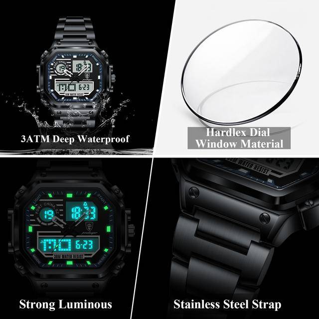 "description": "<ul>\n <li>Brand Name: Poedagar</li>\n <li>Model Number: 993SS</li>\n <li>Year of Production: 2025</li>\n <li>Gender: Men</li>\n <li>Case Shape: Square</li>\n <li>Material: Stainless Steel</li>\n <li>Band Material Type: Stainless Steel</li>\n <li>Case Material: Alloy</li>\n <li>Dial Window Material Type: Hardlex</li>\n <li>Dial Display: Pointer</li>\n <li>Clasp Type: Push Button Hidden Clasp</li>\n <li>Movement: Quartz</li>\n <li>Movement Brand: Chenlong</li>\n <li>Feature: Alarm, Day/Date, Chronograph, Led Display, Luminous, Waterproof</li>\n <li>Style: Sporty, Street</li>\n <li>Type: Antique, Charm, Fashion, Luxury</li>\n <li>Band Length: 22 cm</li>\n <li>Band Width: 22 mm</li>\n <li>Case Thickness: 14 mm</li>\n <li>Dial Diameter: 44 mm</li>\n <li>Water Resistance Depth: 3 bar</li>\n <li>Weight: 137 g</li>\n <li>Warranty: 1 Year</li>\n <li>Boxes Included: Yes</li>\n <li>Place of Origin: China</li>\n</ul>",