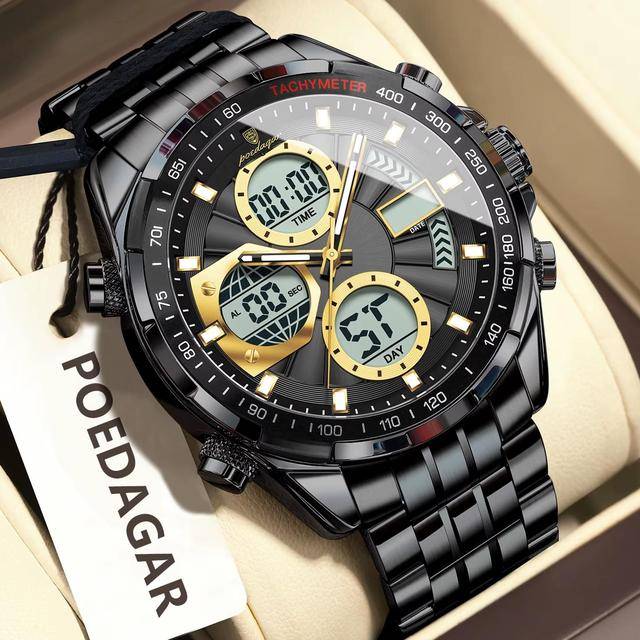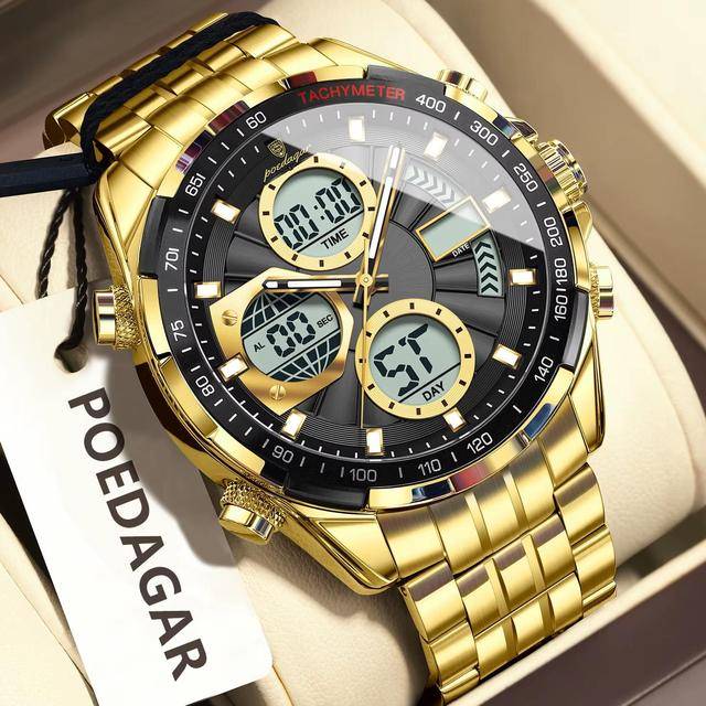 "description_ar": "<div dir=\"ltr\"><ul>\n <li>Brand Name: Poedagar</li>\n <li>Model Number: 939</li>\n <li>Year of Production: 2025</li>\n <li>Gender: Men</li>\n <li>Case Shape: Round</li>\n <li>Material: Stainless Steel</li>\n <li>Band Material Type: Stainless Steel</li>\n <li>Case Material: Alloy</li>\n <li>Dial Window Material Type: Hardlex</li>\n <li>Dial Display: Pointer</li>\n <li>Clasp Type: Push Button Hidden Clasp</li>\n <li>Movement: Quartz</li>\n <li>Movement Brand: Chenlong</li>\n <li>Feature: Chronograph, Luminous, Waterproof</li>\n <li>Style: Business, Casual, Luxury</li>\n <li>Type: Antique, Business, Fashion, Luxury</li>\n <li>Band Length: 23 cm</li>\n <li>Band Width: 20 mm</li>\n <li>Case Thickness: 14 mm</li>\n <li>Dial Diameter: 42 mm</li>\n <li>Water Resistance Depth: 3 bar</li>\n <li>Weight: 119 g</li>\n <li>Warranty: 1 Year</li>\n <li>Boxes Included: Yes</li>\n <li>Place of Origin: China</li>\n</ul></div>",