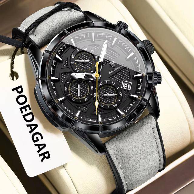 "description": "<ul>\n <li>Brand Name: Poedagar</li>\n <li>Model Number: E108</li>\n <li>Year of Production: 2025</li>\n <li>Gender: Men</li>\n <li>Case Shape: Round</li>\n <li>Material: Alloy</li>\n <li>Band Material Type: Leather</li>\n <li>Case Material: Alloy</li>\n <li>Dial Window Material Type: Hardlex</li>\n <li>Dial Display: Pointer</li>\n <li>Clasp Type: Buckle</li>\n <li>Movement: Quartz</li>\n <li>Movement Brand: Chenlong</li>\n <li>Feature: Chronograph, Complete Calendar, Day/Date, Luminous</li>\n <li>Style: Casual, Luxury, Modern, Sport</li>\n <li>Type: Business, Coin, Fashion, Limited Edition, Luxury, Sport</li>\n <li>Band Length: 24 cm</li>\n <li>Band Width: 23 mm</li>\n <li>Case Thickness: 16 mm</li>\n <li>Dial Diameter: 44 mm</li>\n <li>Water Resistance Depth: 3 bar</li>\n <li>Weight: 96 g</li>\n <li>Warranty: 1 Year</li>\n <li>Boxes Included: Yes</li>\n <li>Place of Origin: China</li>\n</ul>",