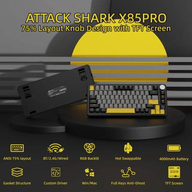 "description": "<h3>Key Features</h3>\n<ul>\n <li><strong>Multi‑Function TFT Smart Display & CNC Knob:</strong> Real‑time system info with a precision‑machined control knob</li>\n <li><strong>75% ANSI Layout & Upgraded Gasket‑Mount:</strong> Balanced acoustics and a soft, flexible typing feel</li>\n <li><strong>5‑Layer Padding Structure:</strong> Full internal filling for enhanced sound dampening and stability</li>\n <li><strong>Triple‑Mode Connectivity:</strong> Bluetooth, 2.4G wireless, and wired with Mac/Windows compatibility</li>\n <li><strong>3‑Pin / 5‑Pin Hot‑Swappable:</strong> Single‑key slotted PCB for consistent switch performance</li>\n <li><strong>Premium ENIG PCB:</strong> Cutting‑edge gold‑plated finish for durability and signal integrity</li>\n <li><strong>Pre‑Lubed Linear Blueberry Switch:</strong> Smooth, refined keystrokes out of the box</li>\n <li><strong>Programmable RGB:</strong> South‑facing LEDs for bright, clean illumination</li>\n <li><strong>4000 mAh Battery:</strong> Long‑lasting power with smart energy‑saving features</li>\n <li><strong>QMK & X85PRO Driver Support:</strong> Full programmability and advanced customization</li>\n <li><strong>OEM Profile PBT Keycaps:</strong> Durable, fade‑resistant legends with ergonomic shaping</li>\n</ul>",
