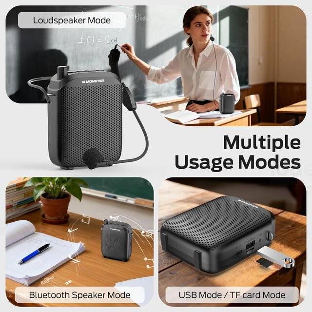 "description": "<h3>Key Attributes</h3>\n<ul>\n <li><strong>Bluetooth:</strong> Bluetooth 6.0 with stable, low‑latency connection</li>\n <li><strong>Function:</strong> Portable voice amplifier, microphone speaker system</li>\n\n <li><strong>Microphone:</strong> Includes wired microphone for clear, powerful amplification</li>\n\n <li><strong>Playback Sources:</strong> Bluetooth, USB drive, TF card, MIC input</li>\n <li><strong>Recording:</strong> Built‑in recording function (saves to TF card)</li>\n\n <li><strong>Battery:</strong> 1800 mAh removable rechargeable battery</li>\n <li><strong>Battery Life:</strong> Up to 12 hours voice amplification; up to 32 hours music playback (medium volume)</li>\n\n <li><strong>Weight:</strong> ~232 g</li>\n <li><strong>Controls:</strong> Simple rotary volume knob</li>\n\n <li><strong>Use Cases:</strong> Classroom teaching, presentations, guided tours, fitness coaching, outdoor events, market promotions, public speaking</li>\n</ul>",