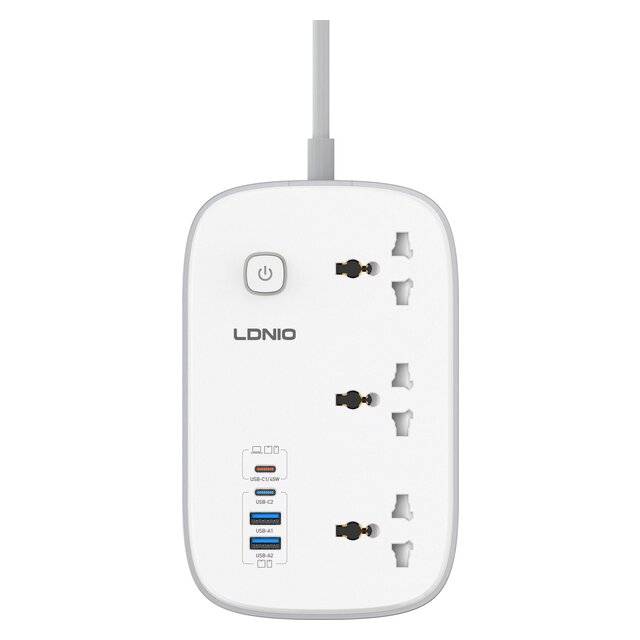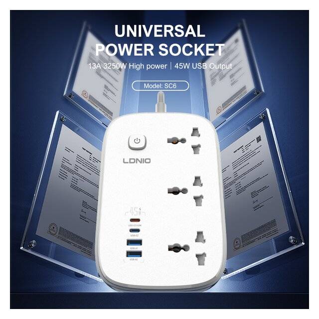 "description_ar": "<div dir=\"ltr\"><h3>Key Specifications</h3>\n\n<ul>\n <li><strong>Rated Voltage:</strong> 100–250V</li>\n <li><strong>Rated Current:</strong> 10A</li>\n <li><strong>Type:</strong> Extension Socket</li>\n <li><strong>Application:</strong> Residential / General‑Purpose / Smart Home</li>\n <li><strong>Grounding:</strong> Standard Grounding</li>\n <li><strong>IP Level:</strong> IP67</li>\n <li><strong>Feature:</strong> With USB Ports</li>\n <li><strong>AC Outlets:</strong> 3 Outlets</li>\n <li><strong>Material:</strong> ABS, PVC, GaN</li>\n <li><strong>USB Ports:</strong> 4 Ports (2× USB‑A, 2× USB‑C)</li>\n <li><strong>Cable Length:</strong> 2 m</li>\n <li><strong>Model Number:</strong> SC6</li>\n <li><strong>Brand:</strong> LDNIO</li>\n <li><strong>Origin:</strong> Guangdong, China</li>\n <li><strong>Product Name:</strong> Power Plug Board Socket</li>\n <li><strong>Power:</strong> 100–250V~ 50/60Hz, 13A, 3250W Max</li>\n <li><strong>USB Board Input:</strong> 100–240V~ 50/60Hz, 1.5A Max</li>\n <li><strong>USB‑C1/C2 Output:</strong> 5V/3A, 9V/3A, 12V/3A, 15V/3A, 20V/3.25A (65W Max)</li>\n <li><strong>USB‑A1/A2 Output:</strong> 4.5V/5A, 5V/4.5A, 5V/9V/12V/20V/3A (60W Max)</li>\n <li><strong>Warranty:</strong> 12 Months</li>\n <li><strong>Plug Types:</strong> UK / US / EU / Universal</li>\n <li><strong>Standard:</strong> Fully CE & ROHS Approved</li>\n <li><strong>Function:</strong> Easy Life</li>\n</ul>\n</div>",