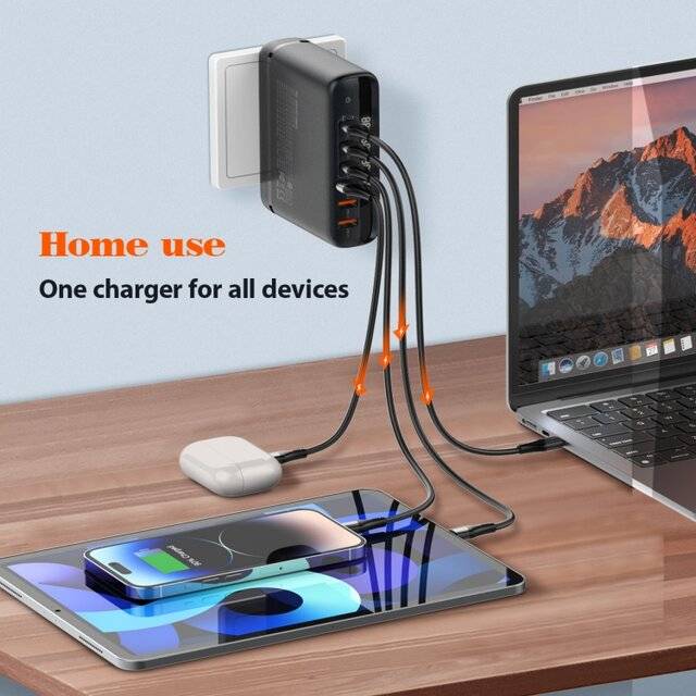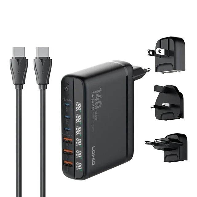 "description": "<ul>\n <li><strong>Input:</strong> 100–240V, 50–60Hz, 2.5A (Max)</li>\n <li><strong>C1 Output:</strong> 5V/3A, 9V/3A, 12V/3A, 15V/3A, 20V/5A (100W Max), PPS: 3.3–21V/5A</li>\n <li><strong>C2 Output:</strong> 5V/3A, 9V/3A, 12V/3A, 15V/3A, 20V/5A (100W Max), PPS: 3.3–21V/5A</li>\n <li><strong>C3 Output:</strong> 5V/3A, 9V/3A, 12V/3A, 15V/3A, 20V/5A (100W Max), PPS: 3.3–21V/5A</li>\n <li><strong>A1 Output:</strong> 4.5V/5A, 5V/4.5A, 5V/3A, 9V/3A, 12V/2.5A, 20V/1.5A (30W Max)</li>\n <li><strong>A2 Output:</strong> 4.5V/5A, 5V/4.5A, 5V/3A, 9V/3A, 12V/2.5A, 20V/1.5A (30W Max)</li>\n <li><strong>A3 Output:</strong> 4.5V/5A, 5V/4.5A, 5V/3A, 9V/3A, 12V/2.5A, 20V/1.5A (30W Max)</li>\n <li><strong>Combined Output (C1 + C2 + C3):</strong> 65W + 45W + 30W (140W Max)</li>\n <li><strong>Total Power:</strong> 140W Max</li>\n</ul>\n\n<h3>Key Features</h3>\n<ul>\n <li>GaN super fast desktop charger, 140W Max</li>\n <li>6-port USB (3A + 3C), PD + QC3.0, supports mainstream quick charging protocols</li>\n <li>LED display shows device charging status</li>\n <li>Widely applicable for iPhone, Samsung, Huawei, Xiaomi, Vivo, and more</li>\n <li>Made with fire-proof PC material, safe to use</li>\n <li>Black textured appearance, compact and portable body</li>\n <li>Includes 1.5 m power cord; UK / US / EU plug options available</li>\n</ul>",