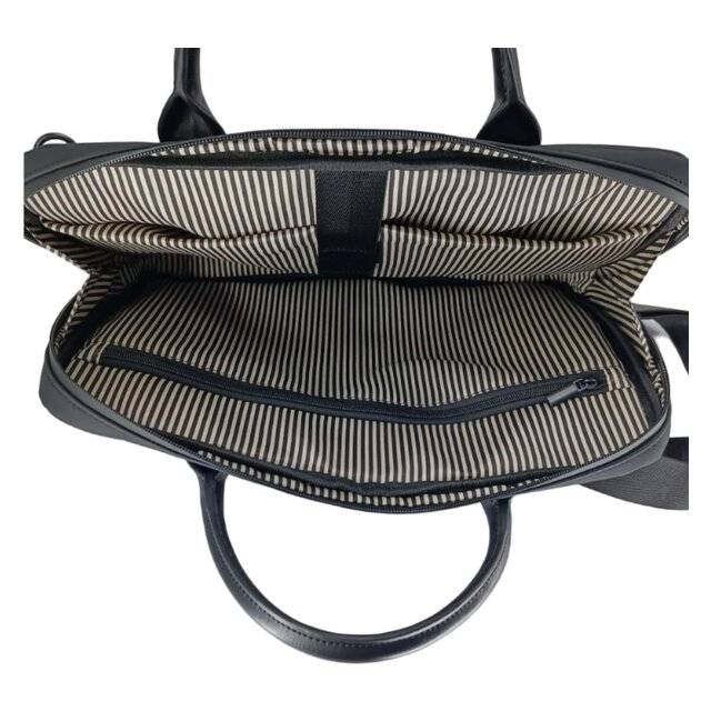 "description_ar": "<div dir=\"ltr\"><ul>\n <li><strong>Compatibility:</strong> Fits laptops up to 15.6 inches</li>\n <li><strong>Material:</strong> Sleek black PU leather for a professional and modern look</li>\n <li><strong>Storage:</strong> Multiple compartments for documents, chargers, and daily essentials</li>\n <li><strong>Design:</strong> Lightweight and durable for long-term comfort</li>\n <li><strong>Carrying Options:</strong> Detachable shoulder strap and sturdy handle</li>\n <li><strong>Use Case:</strong> Ideal for professionals and students — perfect for work or school</li>\n</ul>\n</div>",