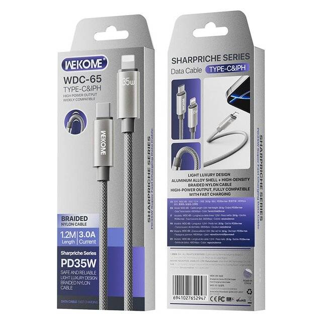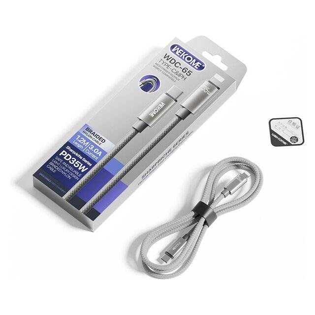 "description_ar": "<div dir=\"ltr\"><ul>\n<li><strong>Model Number:</strong> WDC-65</li>\n<li><strong>Cable Length:</strong> 1200 mm</li>\n<li><strong>Type:</strong> Type-C to iPhone (IPH)</li>\n<li><strong>Cover Material:</strong> Braided</li>\n<li><strong>Transmission Capability:</strong> PD 35W / 480 Mbps</li>\n<li><strong>Color Options:</strong> Black / Gray / Brown</li>\n<li><strong>Product Weight:</strong> 28.5 g</li>\n<li><strong>Packed Dimensions:</strong> 65 × 18 × 175 mm</li>\n<li><strong>Units per Carton:</strong> 250 pcs</li>\n<li><strong>Carton Size:</strong> 60 × 33.5 × 49 cm</li>\n<li><strong>Gross Weight (G.W.):</strong> 13.15 kg</li>\n<li><strong>Certifications:</strong> CE / RoHS / Quality Inspection Repor</li>\n</ul>\n</div>",