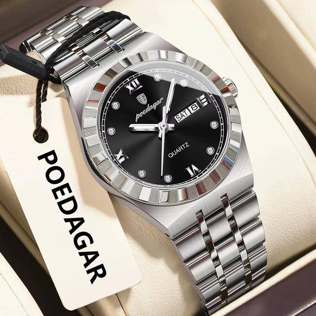 "description": "<ul>\n<li>Brand Name: Poedagar</li>\n<li>Model Number: 873</li>\n<li>Year of Production: 2025</li>\n<li>Gender: Men</li>\n<li>Case Shape: Round</li>\n<li>Material: Stainless Steel</li>\n<li>Band Material Type: Stainless Steel</li>\n<li>Case Material: Alloy</li>\n<li>Dial Window Material Type: Hardlex</li>\n<li>Dial Display: Pointer</li>\n<li>Clasp Type: Push Button Hidden Clasp</li>\n<li>Movement: Quartz</li>\n<li>Movement Brand: Chenlong</li>\n<li>Feature: Day/Date, Luminous, Water Resistant, Waterproof</li>\n<li>Style: Business, Luxury</li>\n<li>Type: Antique, Business, Charm, Luxury</li>\n<li>Band Length: 24 cm</li>\n<li>Band Width: 23 mm</li>\n<li>Case Thickness: 13 mm</li>\n<li>Dial Diameter: 44 mm</li>\n<li>Water Resistance Depth: 3 bar</li>\n<li>Weight: 152 g</li>\n<li>Warranty: 1 Year</li>\n<li>Boxes Included: Yes</li>\n<li>Place of Origin: China</li>\n</ul>",
