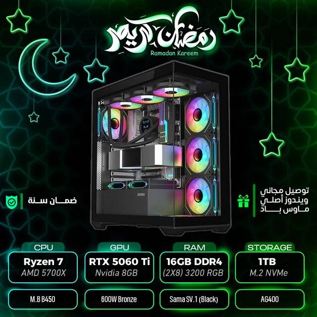 "description_ar": "<div dir=\"ltr\"><ul>\n <li>AMD Ryzen-5 7600</li>\n <li>Radeon RX 9060XT 16GB</li>\n <li>RAM 32GB (2X16) DDR5 6000 RGB</li>\n <li>M.B B650 (Gigabyte)</li>\n <li>1TB M.2 NVMe</li>\n <li>PSU 750w</li>\n <li>Case Sama SV-01</li>\n <li>Cooler AG400</li>\n</ul>\n</div>",