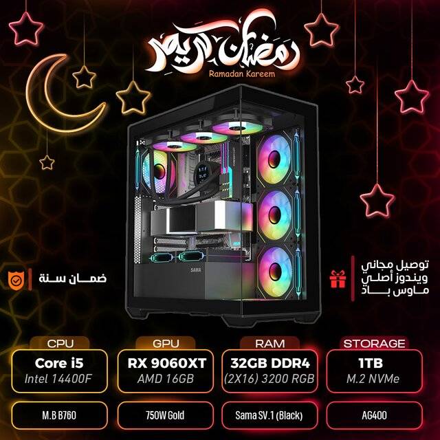 "description_ar": "<div dir=\"ltr\"><ul>\n <li>CPU: Core i5 Intel 14400F </li>\n <li>GPU: RX 9060XT AMD 16GB </li>\n <li>RAM: 32GB DDR4 (2X16) 3200 RGB </li>\n <li>Motherboard: M.B B760 </li>\n <li>Storage: 1TB M.2 NVMe </li>\n <li>PSU: 750W Gold </li>\n <li>Case: Sama SV.1 (Black) </li>\n <li>Cooler: AG400 </li>\n</ul></div>",